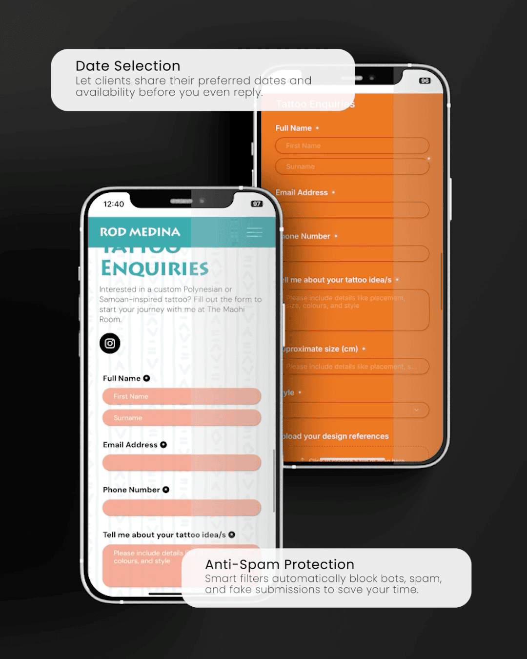 At Ink Marketing, we believe your time is best spent doing what you love: tattooing. That's why we champion the use of lead-qualifying booking forms Strategic forms that help identify serious clients before you respond. on your website. These aren't just simple contact forms; they're strategic tools designed to filter out the noise and connect you directly with high-intent Clients who are ready and motivated to book. , high-quality clients, dramatically reducing the time between initial enquiry and a confirmed booking.